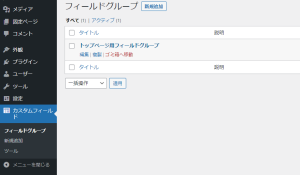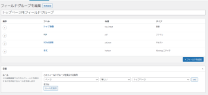 トップページ用のカスタムフィールドは、以下の「トップページ用フィールドグループ」にて管理しています。